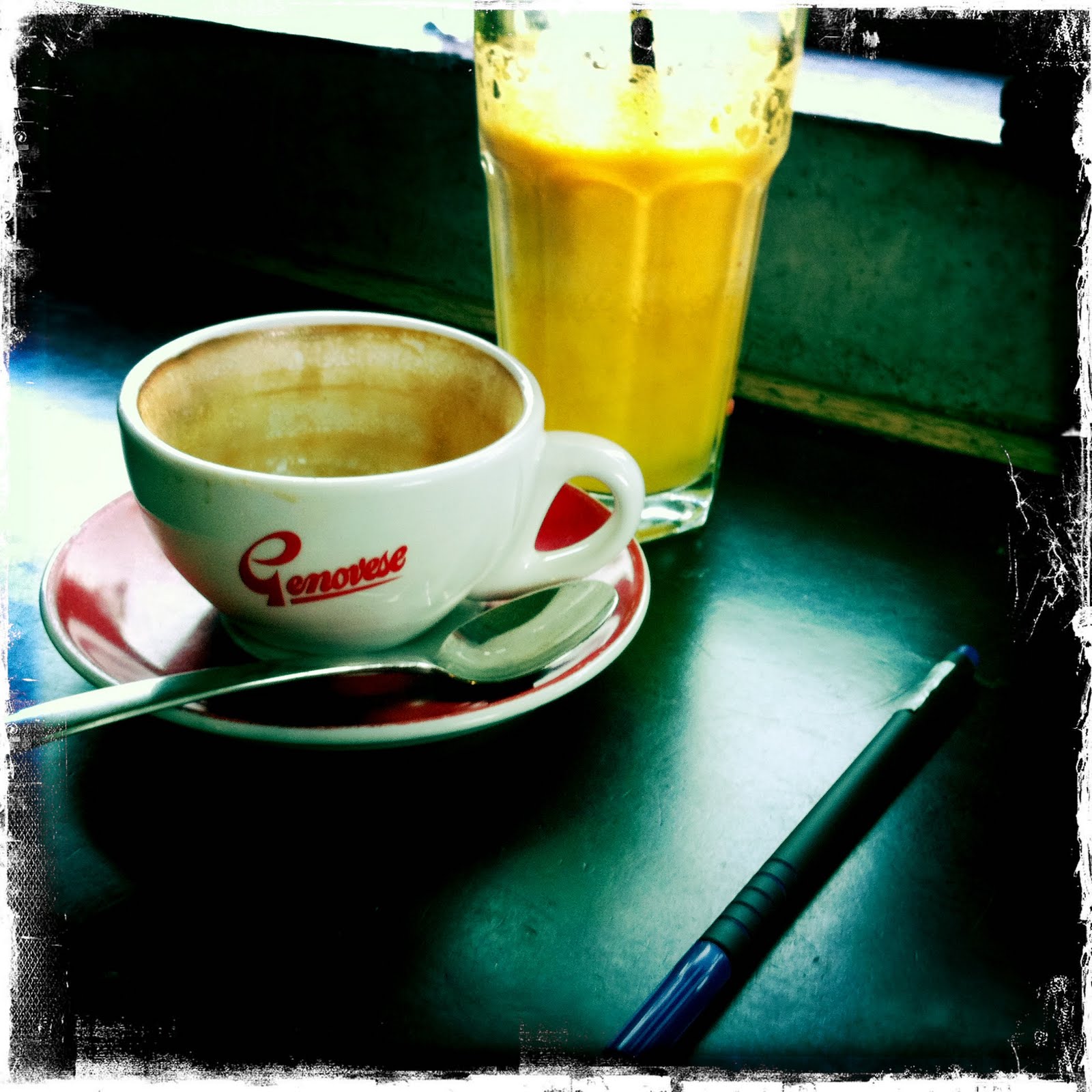 Jerry’s is just down the road from me and I’m not really sure why I hadn’t got there before now, but today was the day. I remember Jerry’s from when Dave lived on Broadway years ago. Today I walked down to St Kilda and on the way there, Jerry’s was awash with cycles and pink lycra so I kept on walking. On the way back, pink had been replaced with more melbournian tones of grey and black which was much more me. I sat in the window with coffee and OJ as it started to rain.