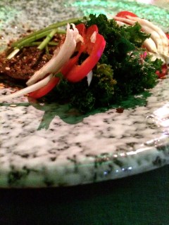 Thin slices of peppered beef with kale.