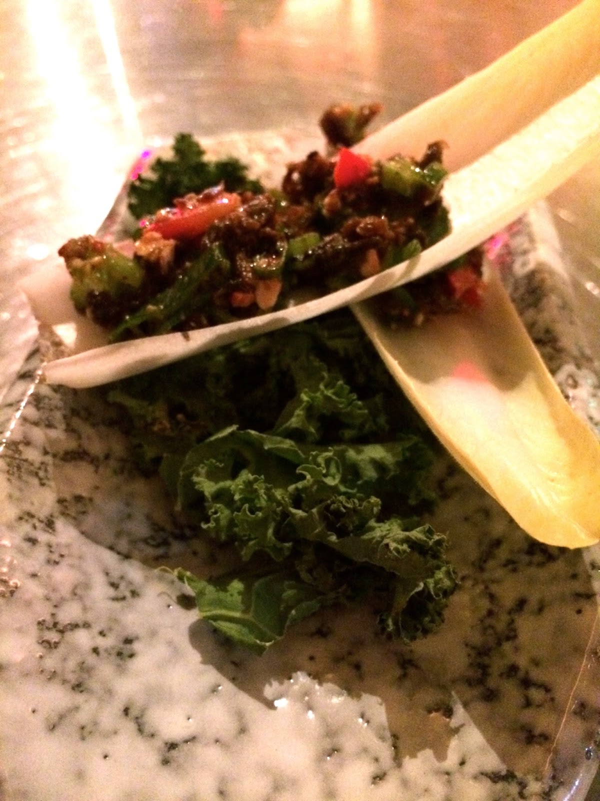 Succulent chicken wings and tiny diced vegetables with spice in an endive leaf.
