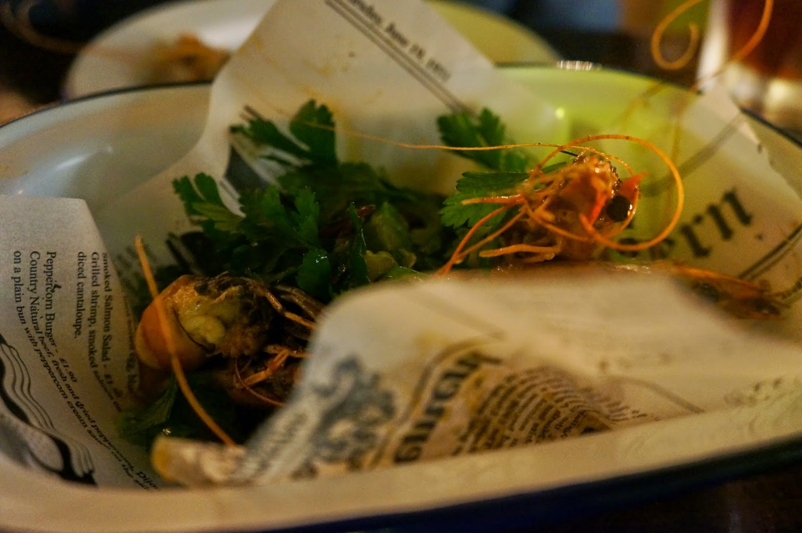 I wanted the Nola BBQ shrimp for two reasons. One, BBQ shrimp just sounds cajun/creole to me. Two, I’m reading a book which features a girl called Nola. Ah, the subtle power of the written word. Nice touch with the presentation, a basket with a fictional June 19th newspaper page and the beady eyes of the prawns just asking for fingers to get dirty with the peeling and extracting of slightly spicy and very buttery flesh. Food interaction is good interaction. Textures and tastes a symbiotic entwining.